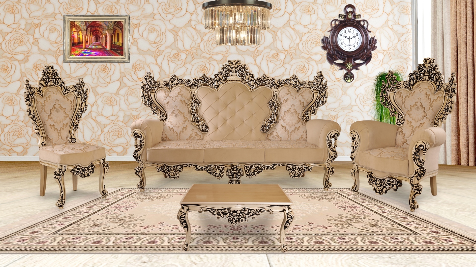یک مبل سلطنتی با منبت فراوان که نشیمن مبلها و کاناپه به صورت تشک جدا بوده، رنگ ملایم و دلنشینی دارد؛ کاناپه آن به صورت سه قاب چشم نواز است؛ که اندازههای آن به شرح زیر است: ابعاد سه نفره: طول210، عرض75، ارتفاع150 ----- ابعاد تک نفره: طول85، عرض75، ارتفاع150 ----- ابعاد صندلی میزبان: طول85، عرض75، ارتفاع150