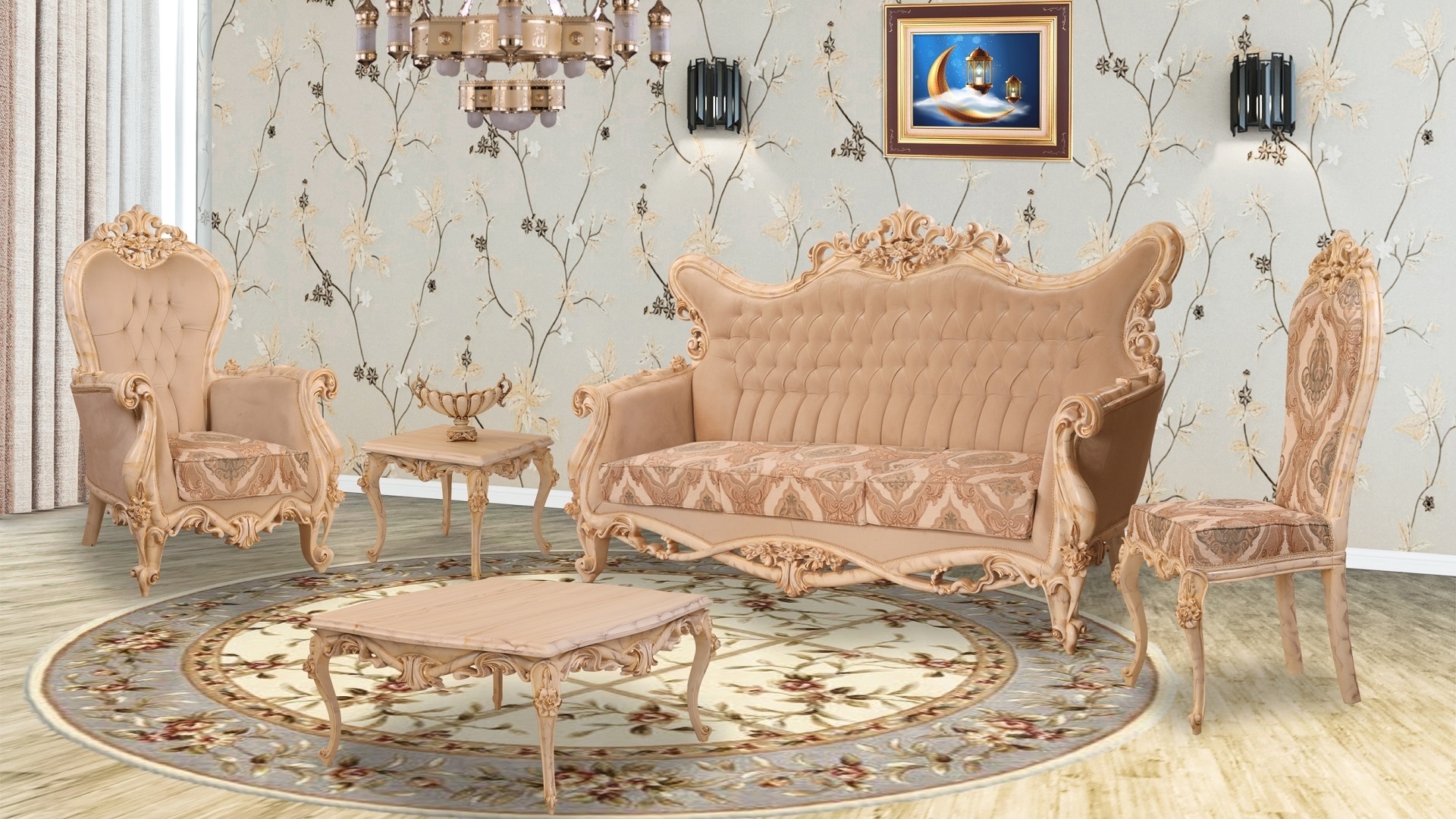 در این مدل مبلها و کاناپهها به صورت، ترکیبی دسته چوبی و پارچه است و مبل و کاناپه آن به صورت تشک جدا رویهکوبی شده و مناسب برای افراد دوستدار مدل کلاسیک پرنقش است که اندازههای آن به شرح زیر است: ابعاد کاناپه سه نفره: طول 223، عرض 83، ارتفاع 106 ----- ابعاد مبل یک نفره: طول 82، عرض 72، ارتفاع 122 ----- ابعاد صندلی میزبان: طول68* عرض58*ارتفاع128