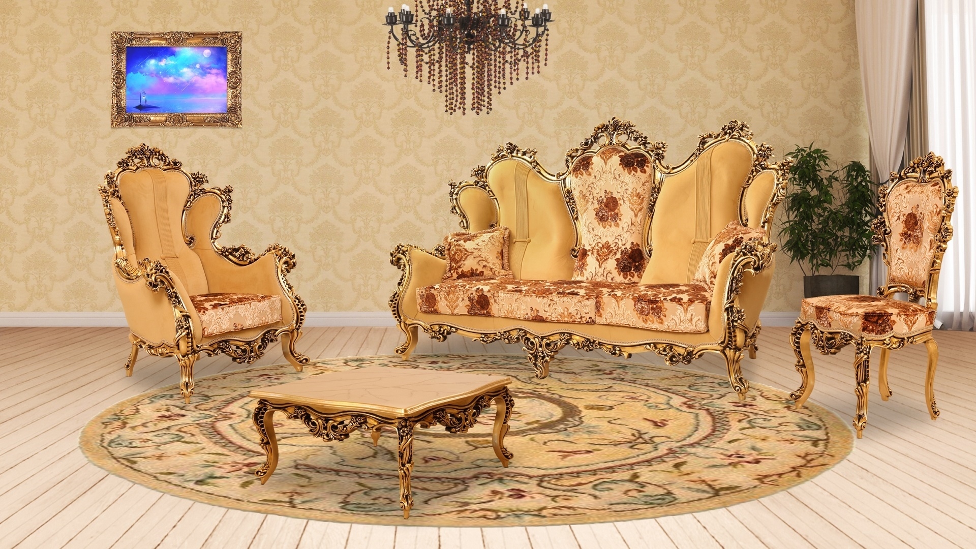 این مدل در رده مبلمانهای کلاسیک بوده و کلیه مبلها و کاناپه تشک به صورت تشک جدا و کاناپه دارای 3 قاب رویهکوبی شده که ادغام چوب و پارچه در دسته این مدل ظاهری زیبا و متفاوت به آن داده است که اندازههای آن به شرح زیر است: ابعاد کاناپه سه نفره: طول 223، عرض 83، ارتفاع 106 ----- ابعاد مبل یک نفره: طول 82، عرض 72، ارتفاع 122 ----- ابعاد صندلی میزبان: طول63* عرض54*ارتفاع117