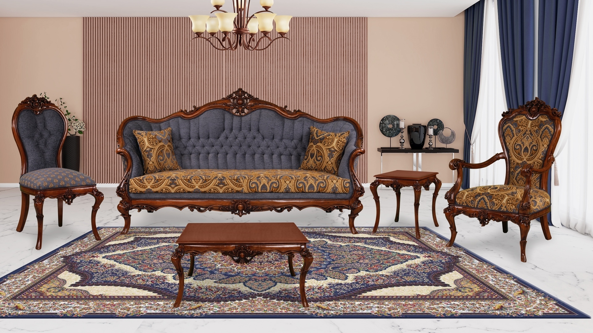 این مدل در رده مبلهای کلاسیک نیمه استیل قرار دارد و دارای نشیمن با تشک ثابت و مبلها با تشک ثابت است و لمسه آن تمام دست بوده که اندازههای آن به شرح زیر است: ابعاد سه نفره: طول220* عرض95* ارتفاع120----- ابعاد یک نفره: طول90* عرض95* ارتفاع120----- ابعاد صندلی میزبان: طول62* عرض65* ارتفاع120